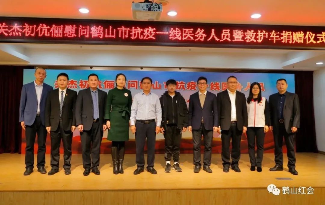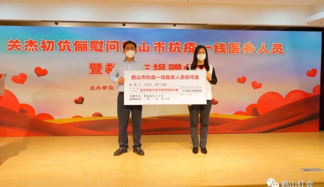 关杰初移交慰问防疫一线医务人员108.148万元支票,市红十字会副会长区丽英代表接收